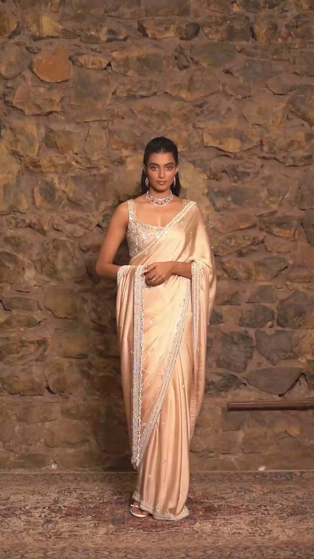 A Peach saree with hand-embroidered sequins, pearls, crystals and glassbeads. Comes with a matching sleeveless blouse.