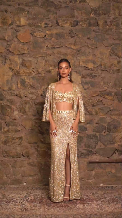 A Gold beaded slim skirt with hand-embroidered sequins, crystals and glassbeads. Comes with a matching floral blouse and beaded cape with slits.