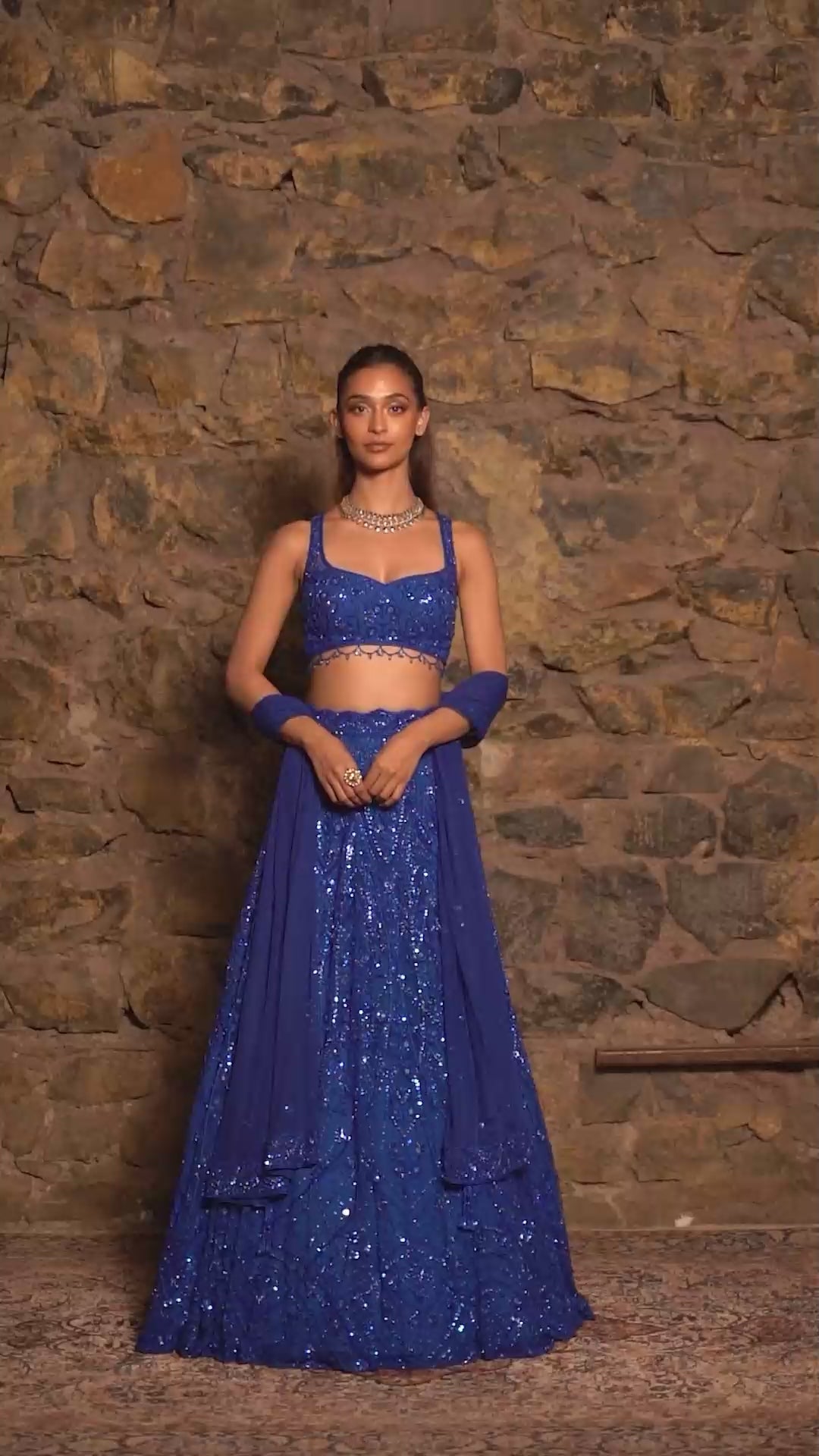 A Royal blue lehenga with hand-embroidered sequins, crystals and glassbeads. Comes with a matching sleeveless blouse and dupatta.