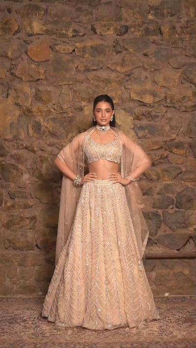 A Nude lehenga with hand-embroidered sequins, crystals, pearls and glassbeads. Comes with a matching sleeveless blouse and dupatta.