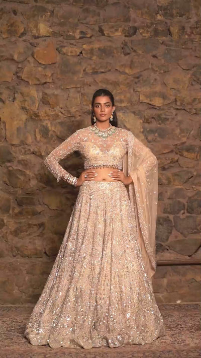 A Champagne gold lehenga with hand-embroidered sequins, crystals and glassbeads. Comes with a matching full sleeves blouse and dupatta.