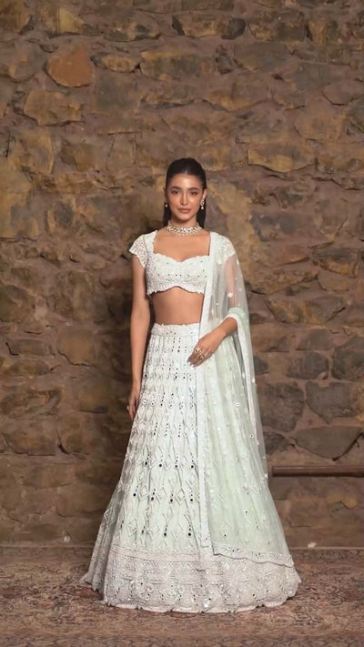 An Aqua lehenga with Ivory hand-embroidered sequins, mirrors and glassbeads. Comes with a matching short sleeve blouse and dupatta.