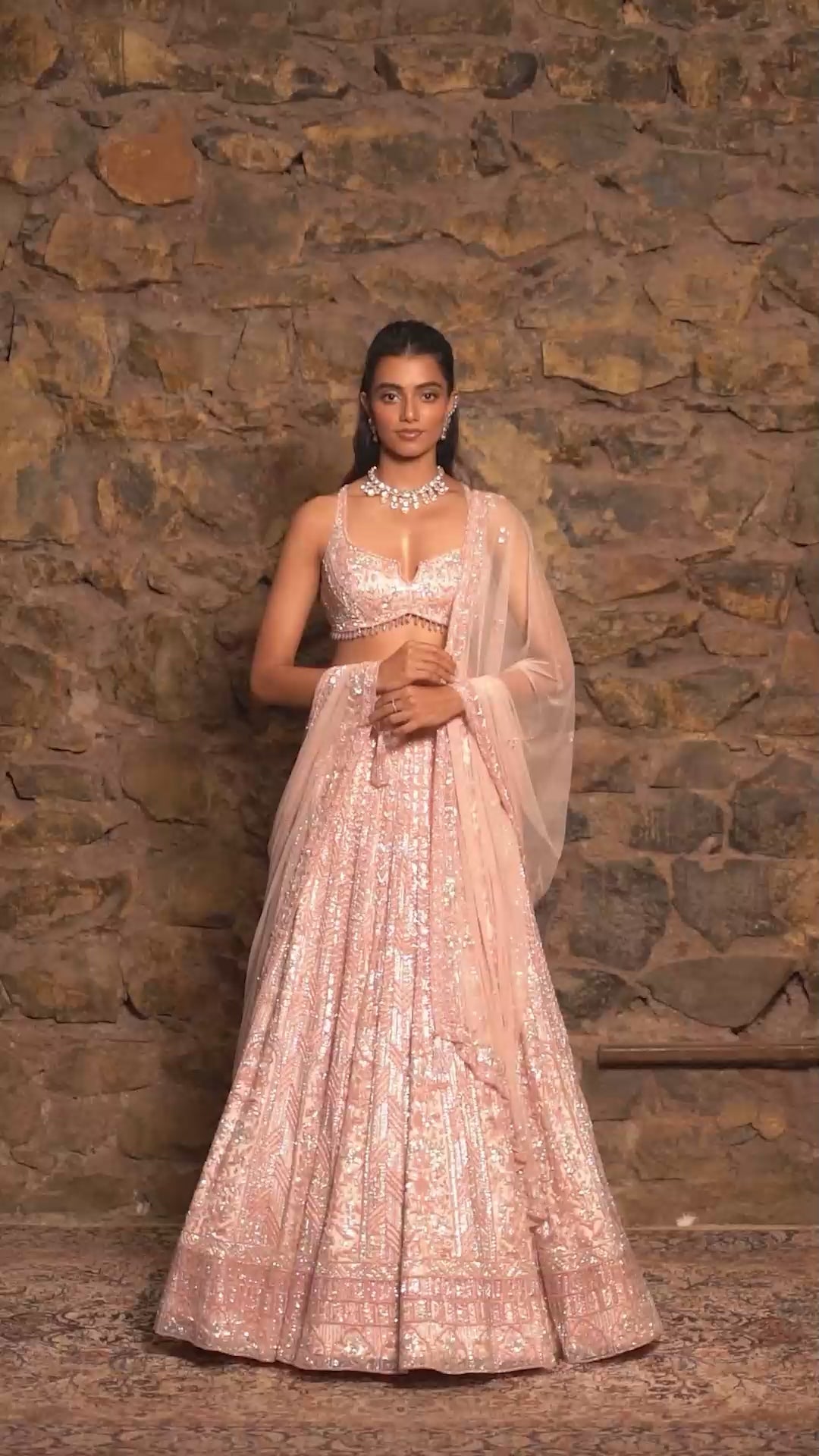 A lehenga with a mix of Peach and Silver hand-embroidered sequins, crystals and glassbeads. Comes with a matching sleeveless blouse and dupatta.