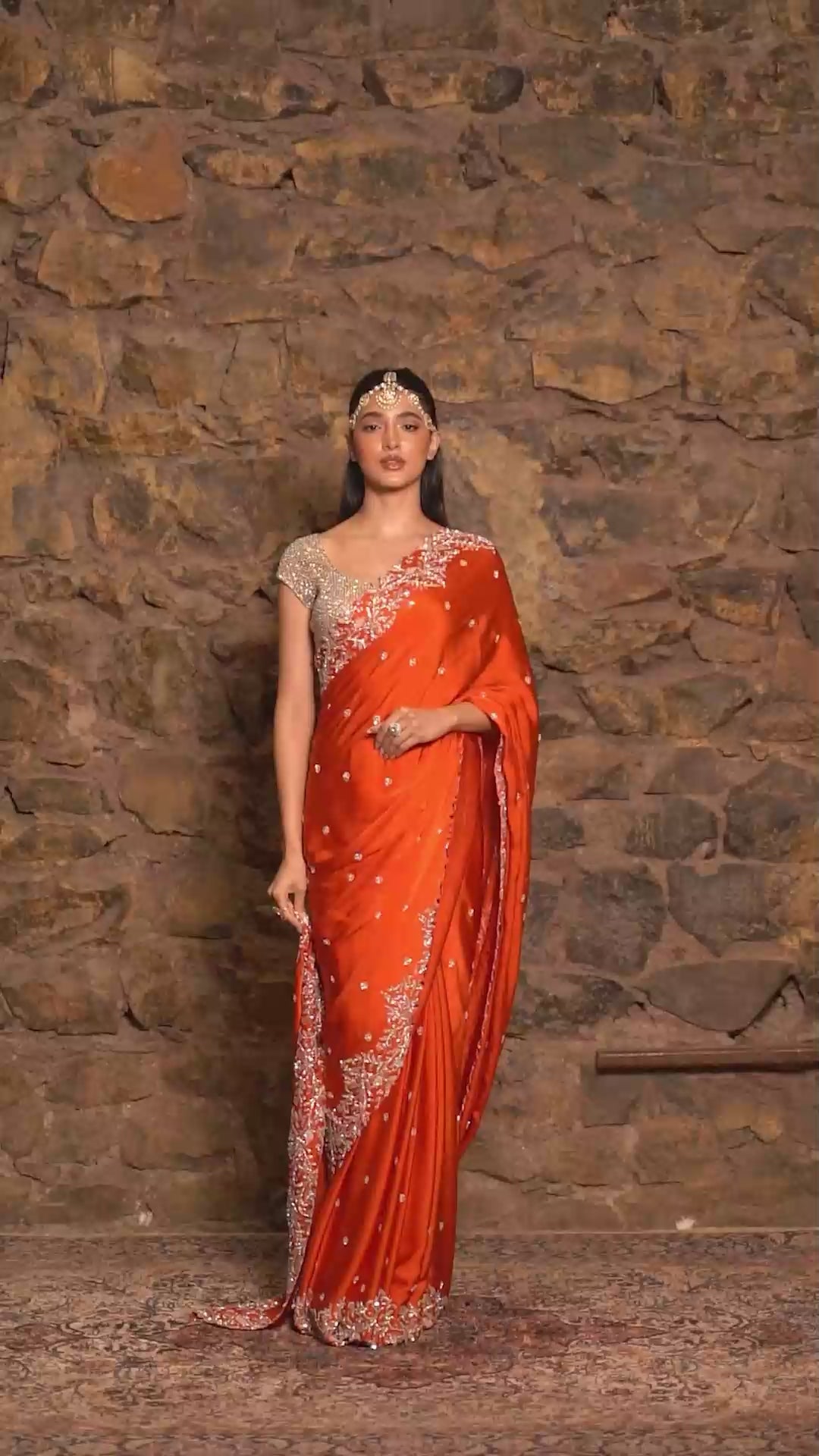 A Marigold saree with champagne hand-embroidered sequins, crystals and glassbeads. Comes with a matching champagne blouse.