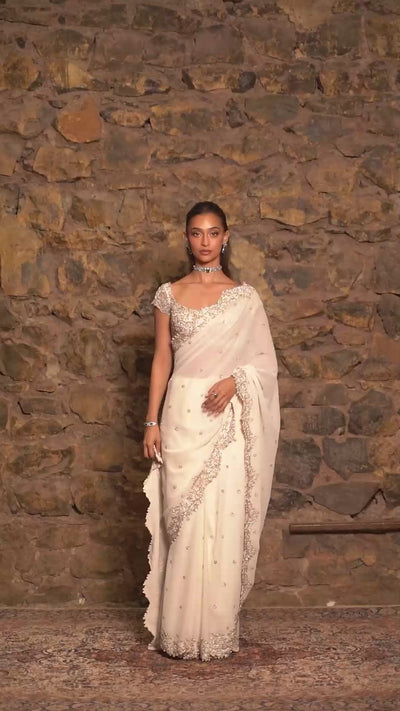 An Ivory saree with champagne hand-embroidered sequins, pearls, crystals and glassbeads. Comes with a matching champagne blouse with draped pearl detailing.