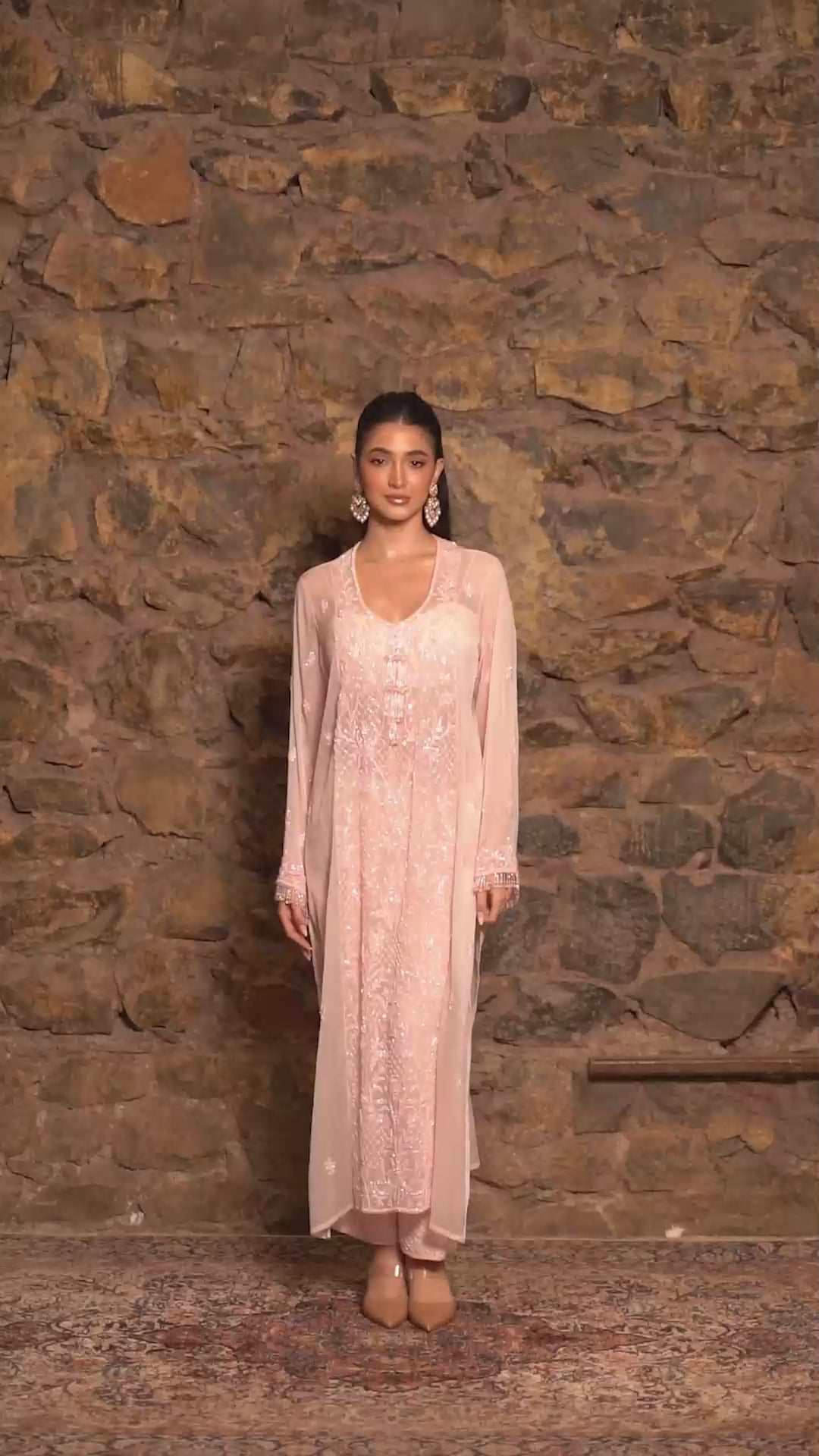 A Soft Pink tunic with hand-embroidered sequins and glassbeads. Comes with an inner blouse & matching embroidered cuff pants.