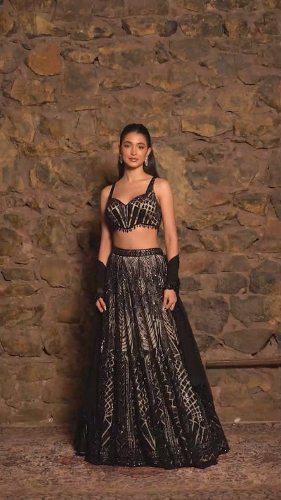 A Nude base lehenga with Black hand-embroidered sequins, crystals and glassbeads. Comes with a matching sleeveless blouse and cape.