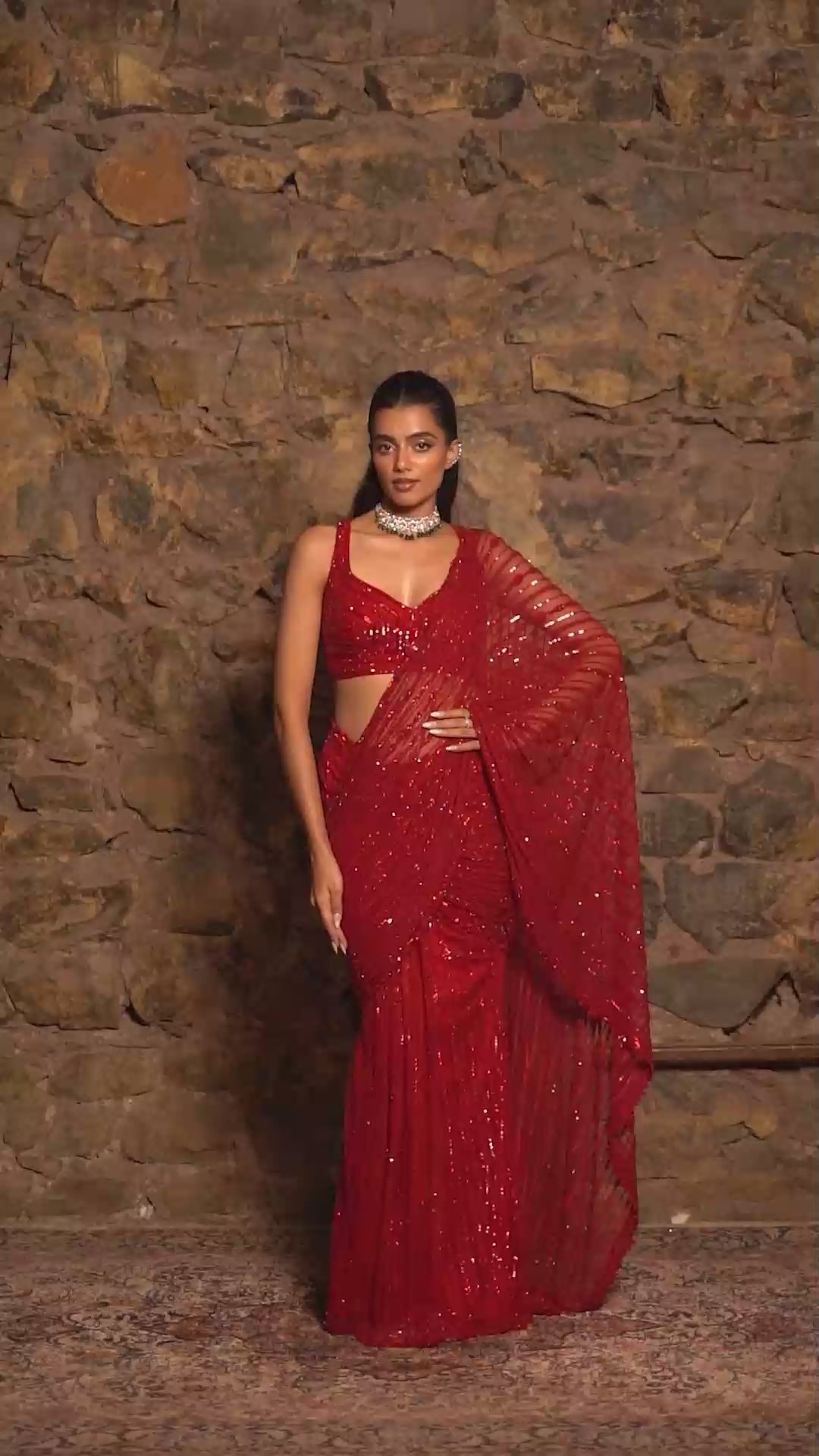 A Red stitched saree with hand-embroidered sequins, crystals and glassbeads. Comes with a matching sleeveless blouse.