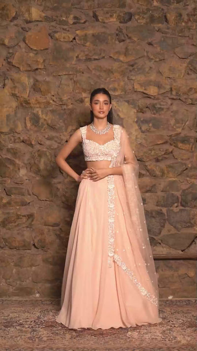 A peach lehenga with ivory hand-embroidered sequins and glassbeads. Comes with a matching sleeveless blouse and dupatta.
