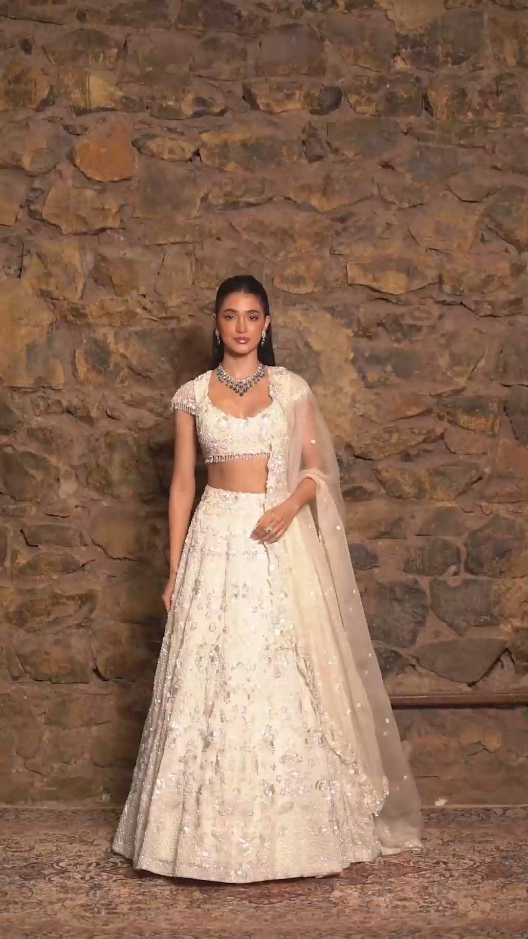 An Ivory lehenga with hand-embroidered sequins, crystals and glassbeads. Comes with a matching short sleeve blouse and dupatta.