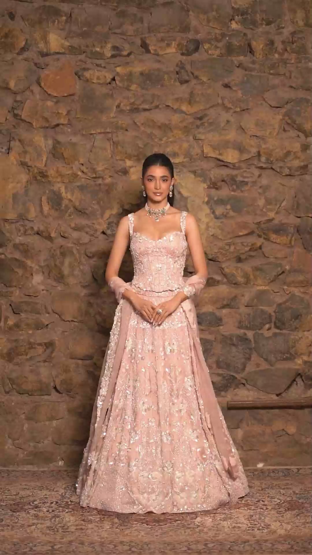 A Rose-pink lehenga with ivory hand-embroidered sequins, pearls and glassbeads. Comes with a matching corset blouse and dupatta.